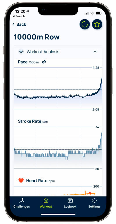 ErgData ahora pone a tu alcance un detallado análisis post-entrenamiento para ayudarte a saber con exactitud qué ha pasado durante tu sesión. Puedes ver todos tus datos de intervalos y de segmentos, así como gráficos de parcial y de ritmo de palada, además del tiempo que has invertido en cada zona de ritmo cardíaco. ErgData también actualizará Apple Health y Google Fit.