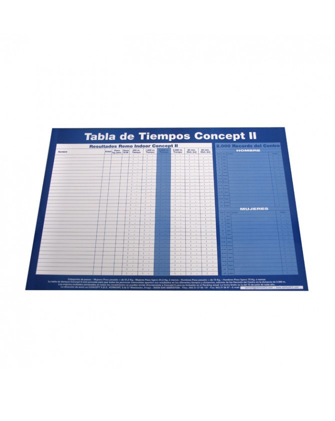 Póster plastificado en el que pueden anotarse y actualizarse fácilmente los mejores tiempos logrados por los usuarios del RowErg en el gimnasio, polideportivo o club. Rotulador incluido. Ancho 85 cm, alto 60 cm.